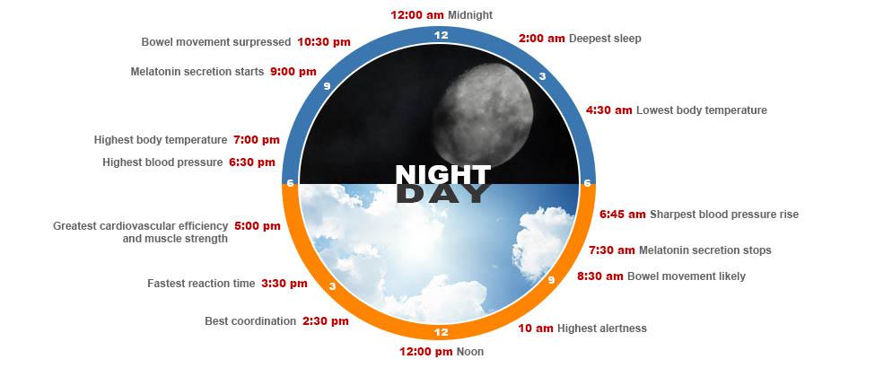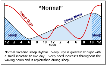 នាឡិកាមេរបស់រាងកាយ ឬSCNគ្រប់គ្រងលើការផលិតអរម៉ូនមេឡាតូនីន(Melatonin)ជាអរម៉ូនដែលធ្វើឱ្យអ្នកងងុយគេង។ ចាប់តាំងពីវាស្ថិតនៅខាងលើសរសៃប្រសាទចក្ខុដែលបញ្ជូនព័ត៌មានពីភ្នែកទៅខួរក្បាលSCNទទួលបានព័ត៌មានអំពីពន្លឺដែលចូលមក។ នៅពេលដែលមានពន្លឺតិចដូចនៅពេលយប់SCNប្រាប់ខួរក្បាលឱ្យបង្កើតអរម៉ូនមេឡាតូនីន(Melatonin)បន្ថែមទៀត ដូច្នេះអាចធ្វើឱ្យលោកអ្នកងងុយដេក។ លំនាំធម្មតានៃការជំរុញការគេងត្រូវបានបង្ហាញនៅក្នុងក្រាហ្វខាងក្រោម។ កម្លាំងជំរុញឱ្យងងុយគេងកើតឡើងតាមសង្វាក់នៃសកម្មភាពប្រចាំថ្ងៃបែបធម្មជាតិ។ វាអស្ចារ្យបំផុតនៅពេលយប់ ជាមួយនឹងការកើនឡើងតិចតួចនៅពាក់កណ្តាលថ្ងៃ។ ឥឡូវនេះ នៅពេលដែលយើងធ្វើតាមសញ្ញាដែលបានផ្តល់ឱ្យដោយរាងកាយ ហើយគេងឱ្យស្របទៅតាមនោះ វាជាការល្អណាស់សម្រាប់ប្រព័ន្ធនេះ។ ប៉ុន្តែ ដូចដែលបានរៀបរាប់នៅកថាខណ្ឌមុន មាននិន្នាការដ៏ល្អមួយក្នុងការពន្យារយៈពេលគេង ដោយសារតែការផ្លាស់ប្តូររបៀបរស់នៅ និងជួនកាលដោយសារតែការប្រែប្រួលជីវសាស្រ្ត។
